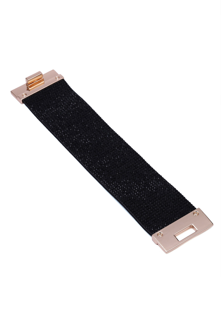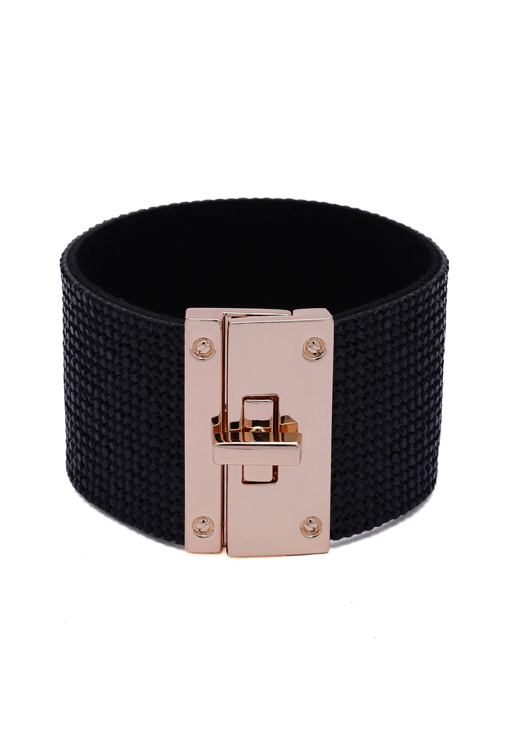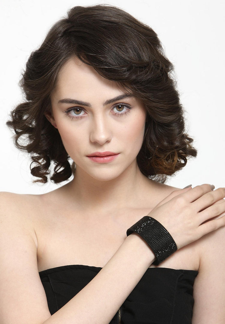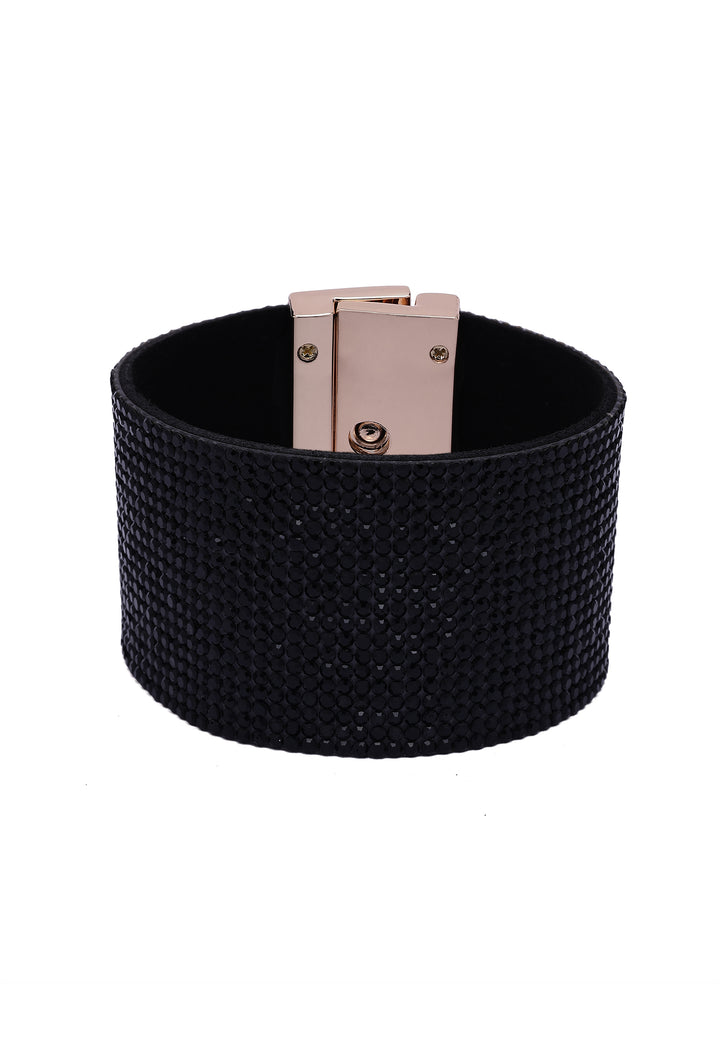 Wrap your wrist in pure diva energy. This wide leather cuff is drenched in black crystals, creating a jet black shimmer that feels straight off the red carpet. Lined with soft suede and finished with a sleek, high-polish clasp, it’s a bold, luxurious statement piece for nights when you want all eyes on you.